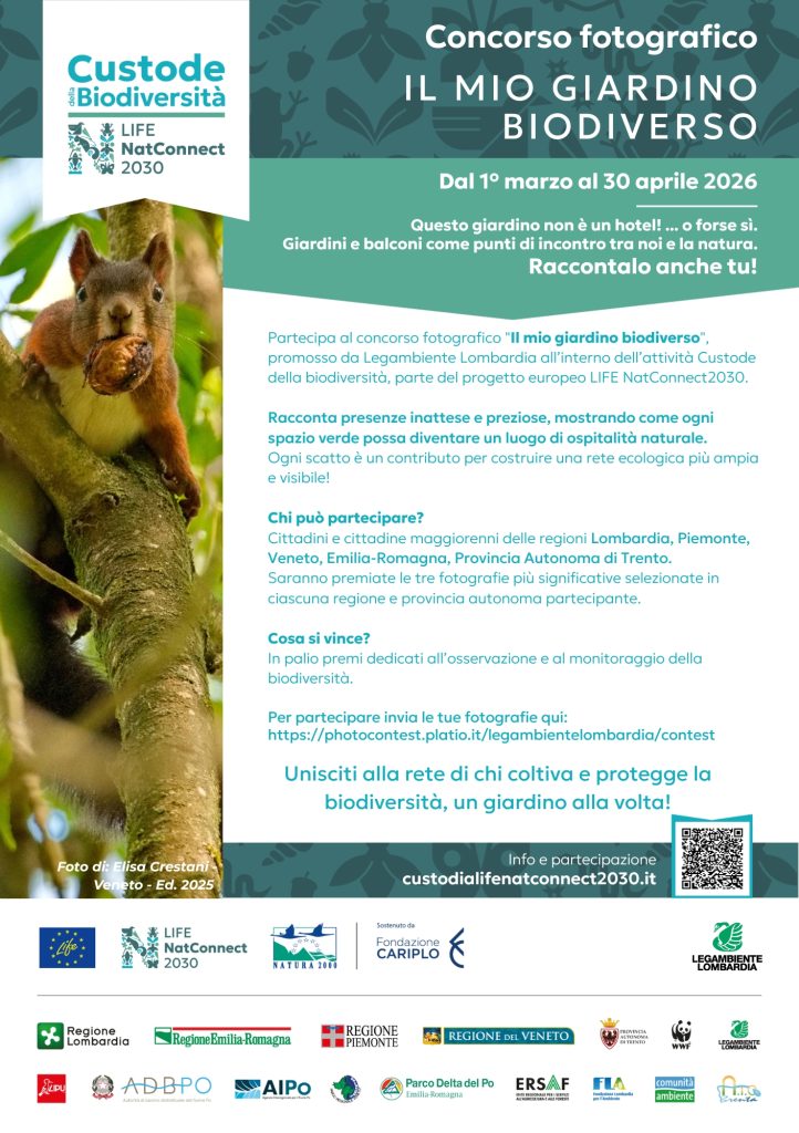 Il concorso è promosso da Legambiente Lombardia, insieme a Legambiente Piemonte, Legambiente Veneto, Legambiente Emilia-Romagna e Legambiente Trento, nell’ambito dell’attività “Custode della biodiversità” del progetto europeo LIFE NatConnect2030.
