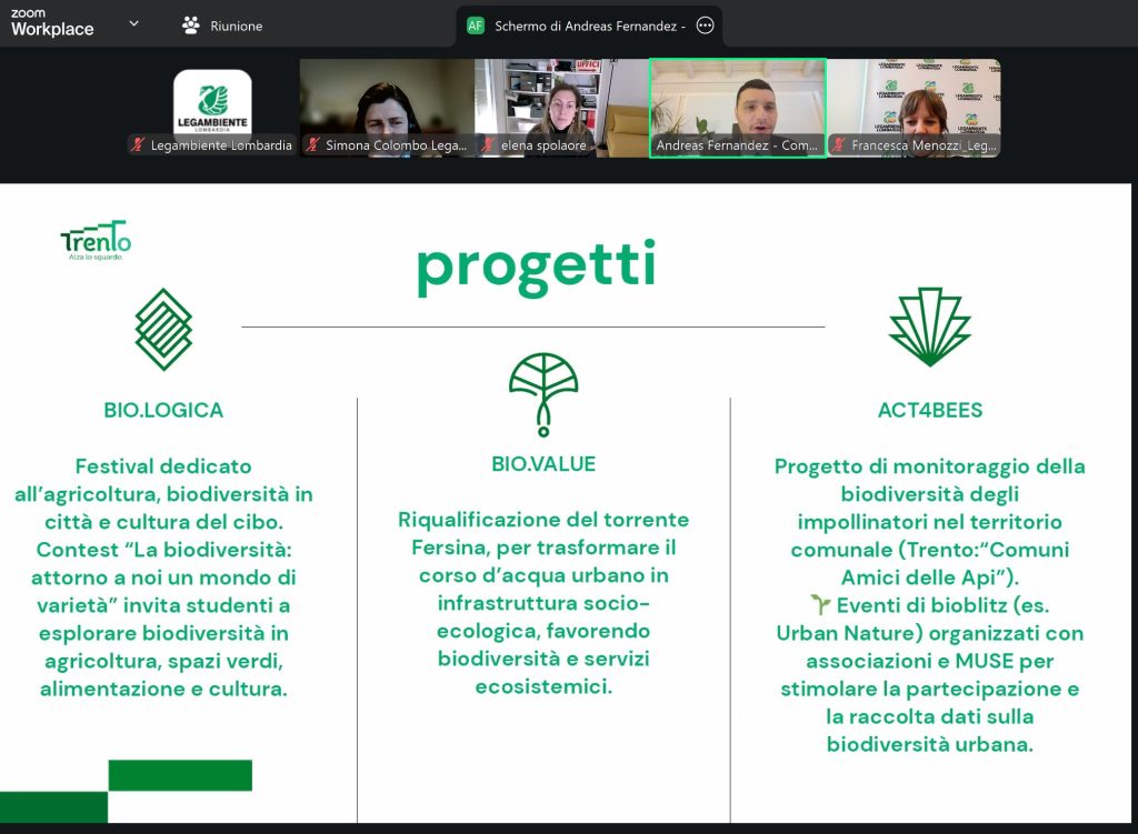 Il Comune di Trento ha illustrato la propria strategia integrata di biodiversità come politica urbana, e i relativi interventi nel piano del verde, così come progetti come Bio.Logica, Bio.Value e Act4Bees, e iniziative di agricoltura biologica.