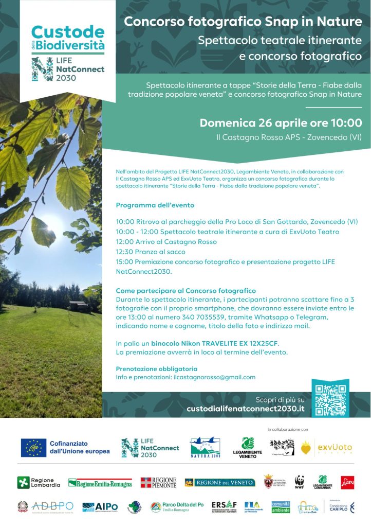 Legambiente Veneto, nel quadro delle attività di Custodia del territorio per il progetto LIFE NatConnect2030, in collaborazione con Il Castagno Rosso APS e ExvUoto Teatro, organizza il concorso fotografico Snap in Nature (iniziativa promossa da Legambiente Lombardia).